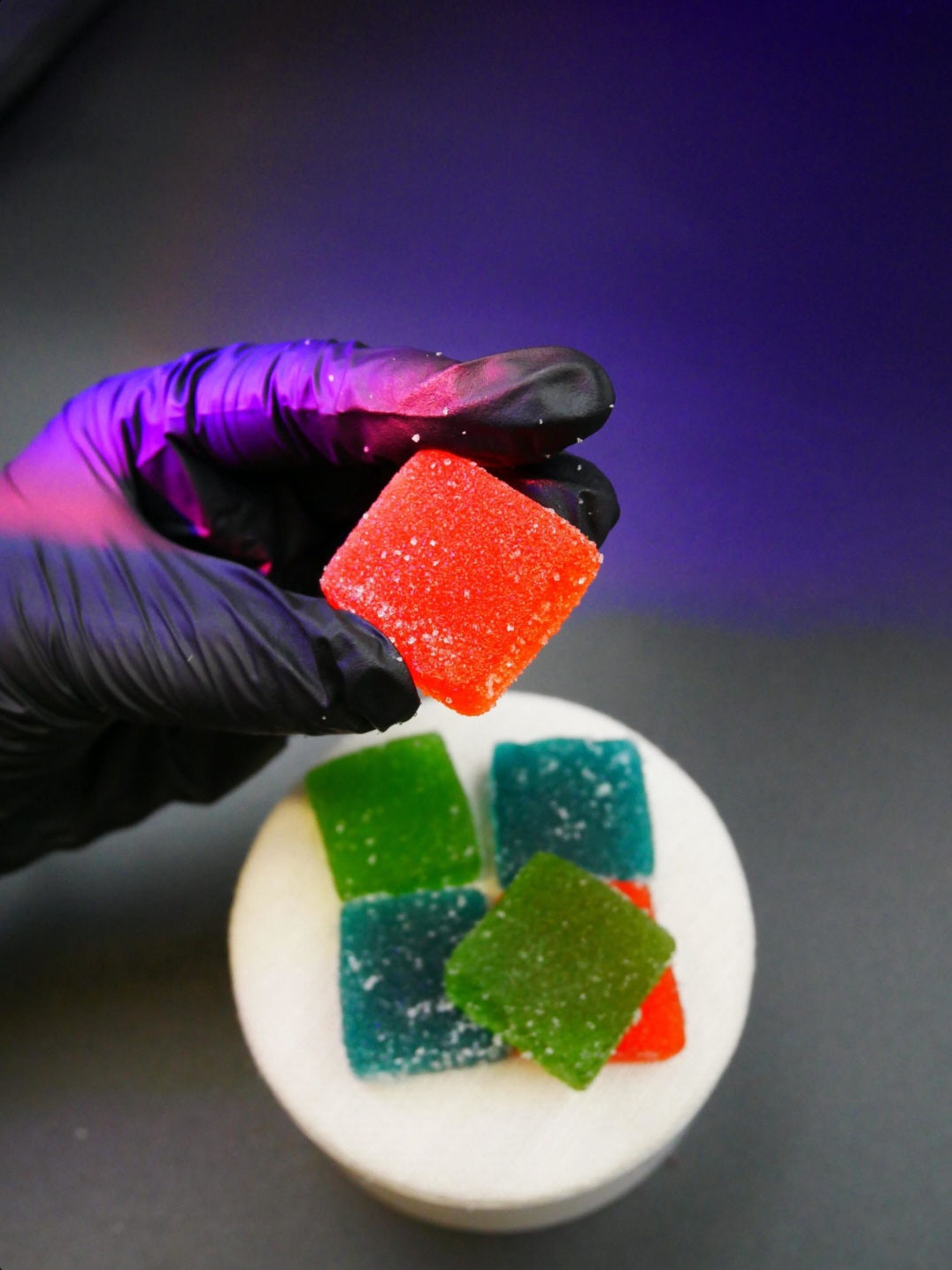 Tout débute par la préparation d’une base uniforme composée de gélatine d’origine végétale, de sucre, de sirop de glucose et d’extraits aromatiques naturels. À ce mélange est ensuite incorporé un distillat de THC rigoureusement dosé, permettant une répartition homogène du composé actif dans chaque pièce.
