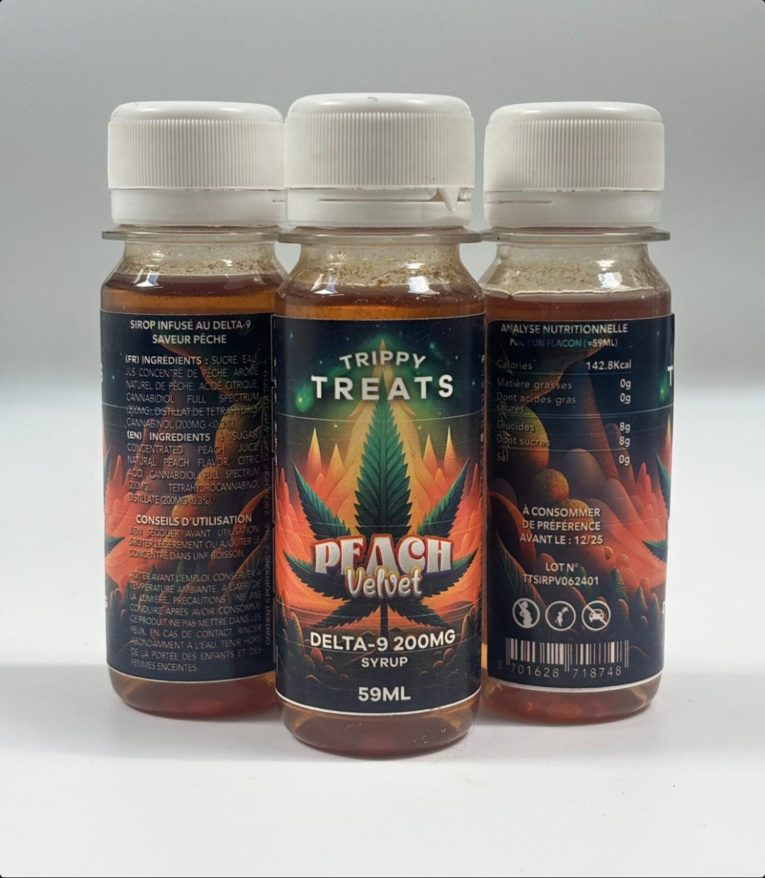 - Élaboration : Sirop aromatisé au Delta-9, décliné en goût pêche ou fraise
